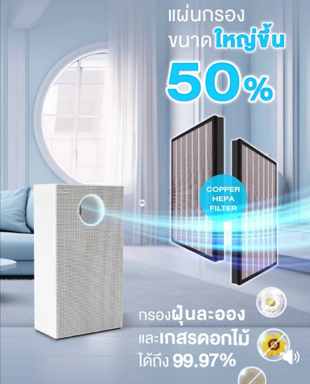 💨 กรองละเอียดกว่าด้วย Copper HEPA Filter (H13) เกรดดีที่สุดในท้องตลาด กรองฝุ่น PM 2.5 เชื้อไวรัส เชื้อราในอากาศได้ถึง 99.9%